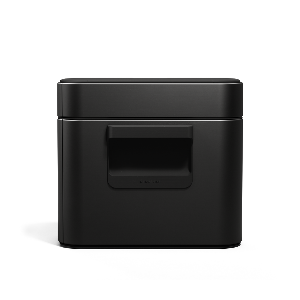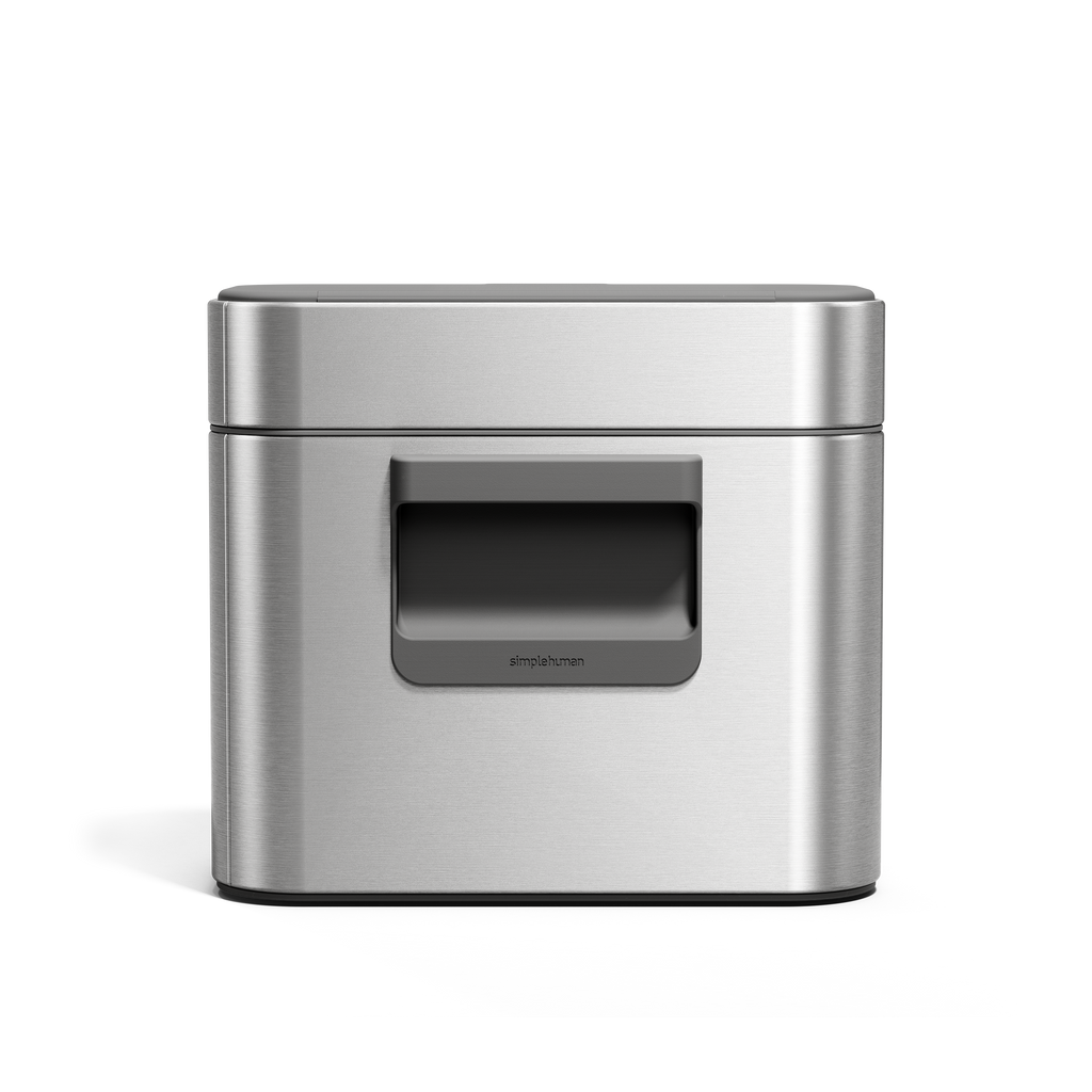 Ela se encaixa em um suporte magnético acoplado à lateral de sua lixeira retangular ou slim, ou pode ser usada separadamente no balcão da cozinha .